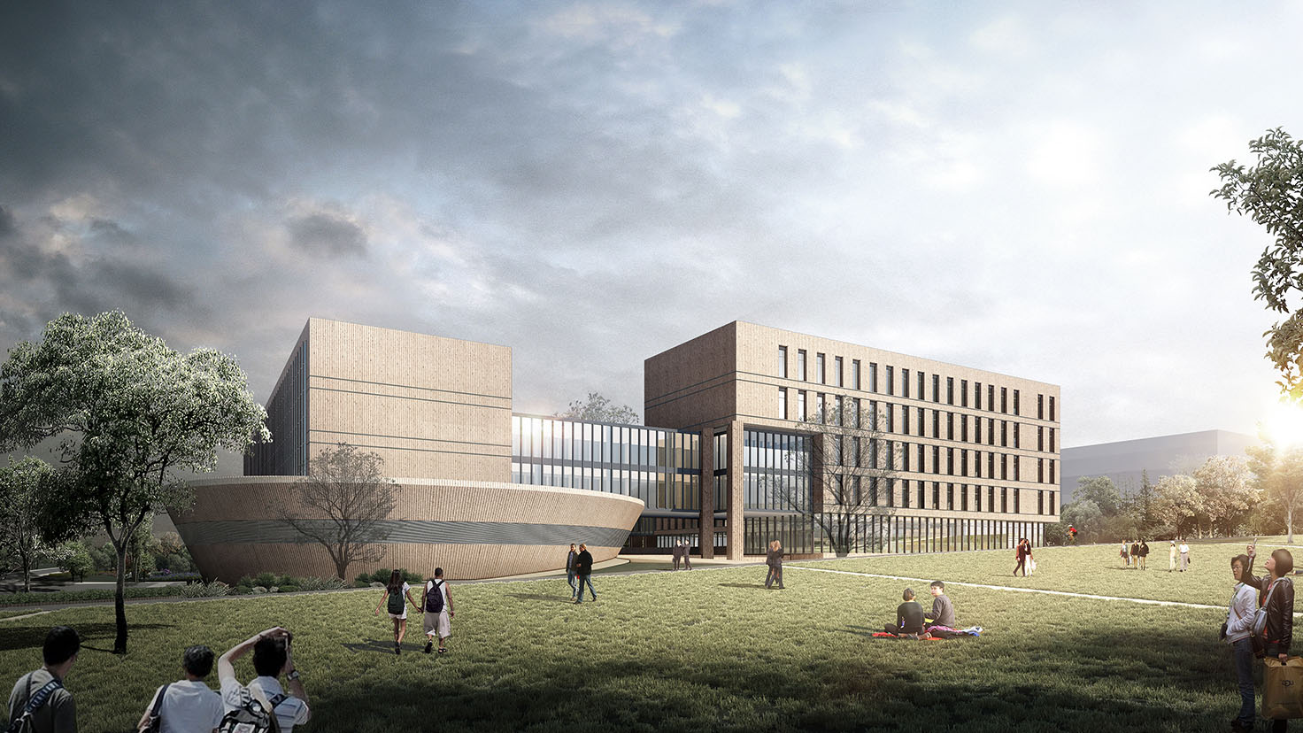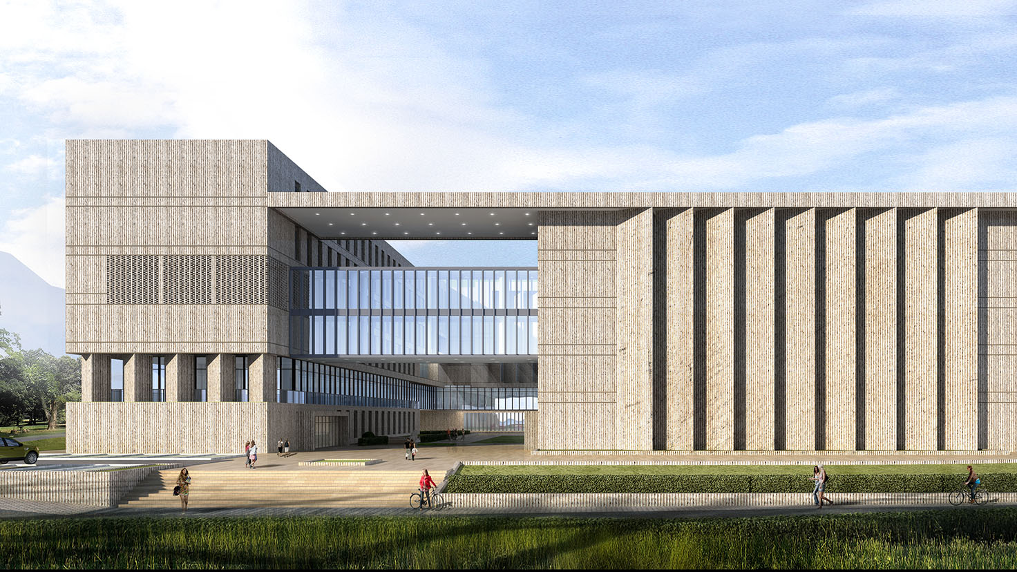 設計背景:本案遵循基地現有特性,合理利用原有地形高差進行設計,將南、北兩棟在高度上形成“北高南低”之勢以呼應地形的特性。充分利用臺階、坡道、連廊等灰空間將建筑空間融于自然環境中,使其建筑與自然環境共融,形成“山水校園”。 通過虛實穿插的庭院空間營造不同的空間關系,整體形成一種“既圍合又開放”的空間布局。這種空間布局既體現了學校各院系對內研究的嚴謹性,同時又利用開放空間滿足各院系之間交流與學習的需要。這種“既圍合又開放”的空間布局同時映襯著毛澤東同志虛懷若谷、海納百川的氣魄,體現的是一種各院系之間的團結精神。"