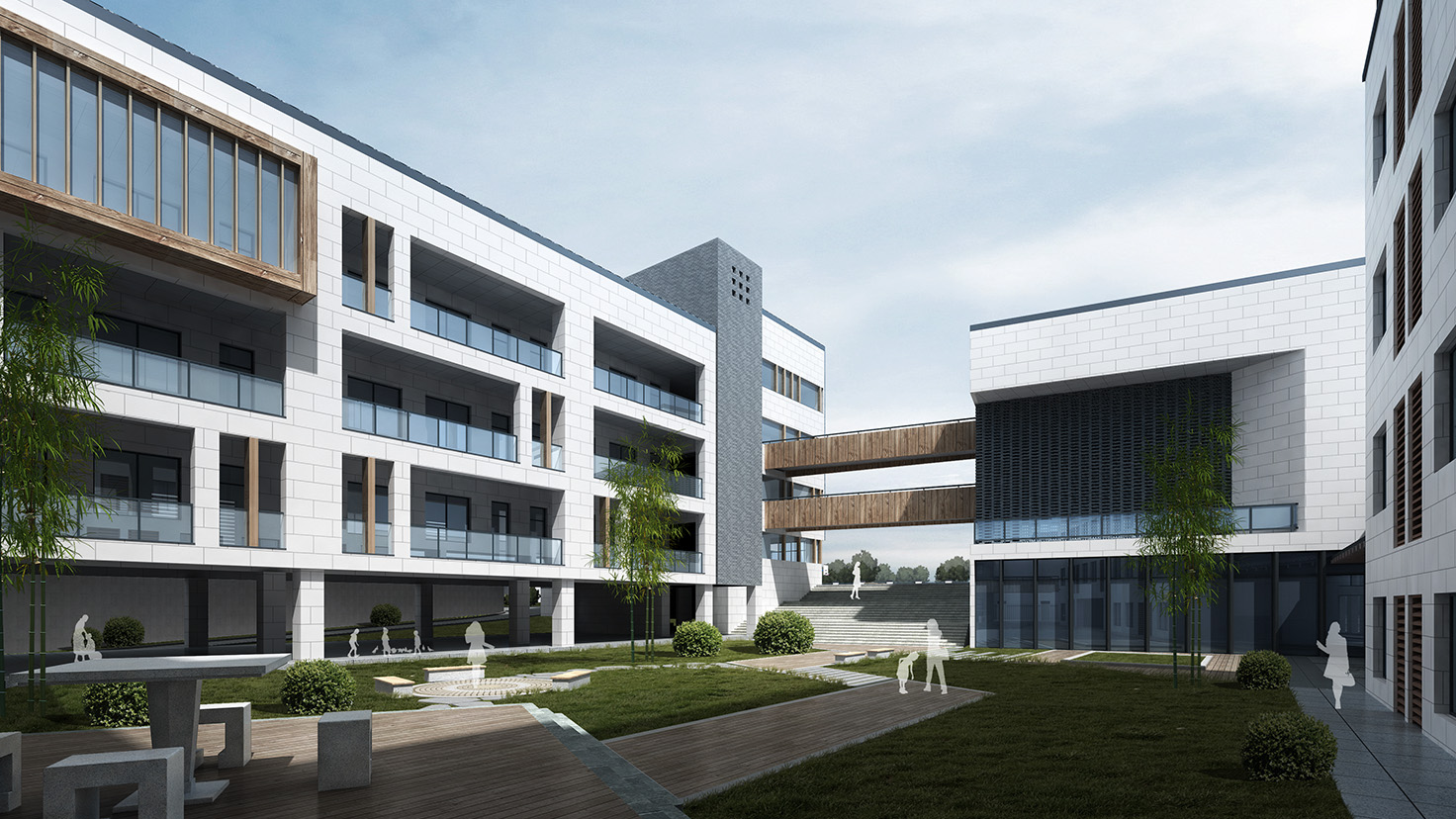 設計背景:學校體現了生態和諧的書院式校園原則,力求山水相映,自然與人和諧。 由于用地偏緊,建筑大都采用三層及五層的多層建筑形式。各組建筑通過連廊和架空平臺聯系在一起,形體柔美,大氣,自然圍合成形態各異的院落空間,柔和的界面,精巧而又不失童趣的建筑造型,傳統與現代完美融合,處處吸引著有著無限求知欲望的孩子們。