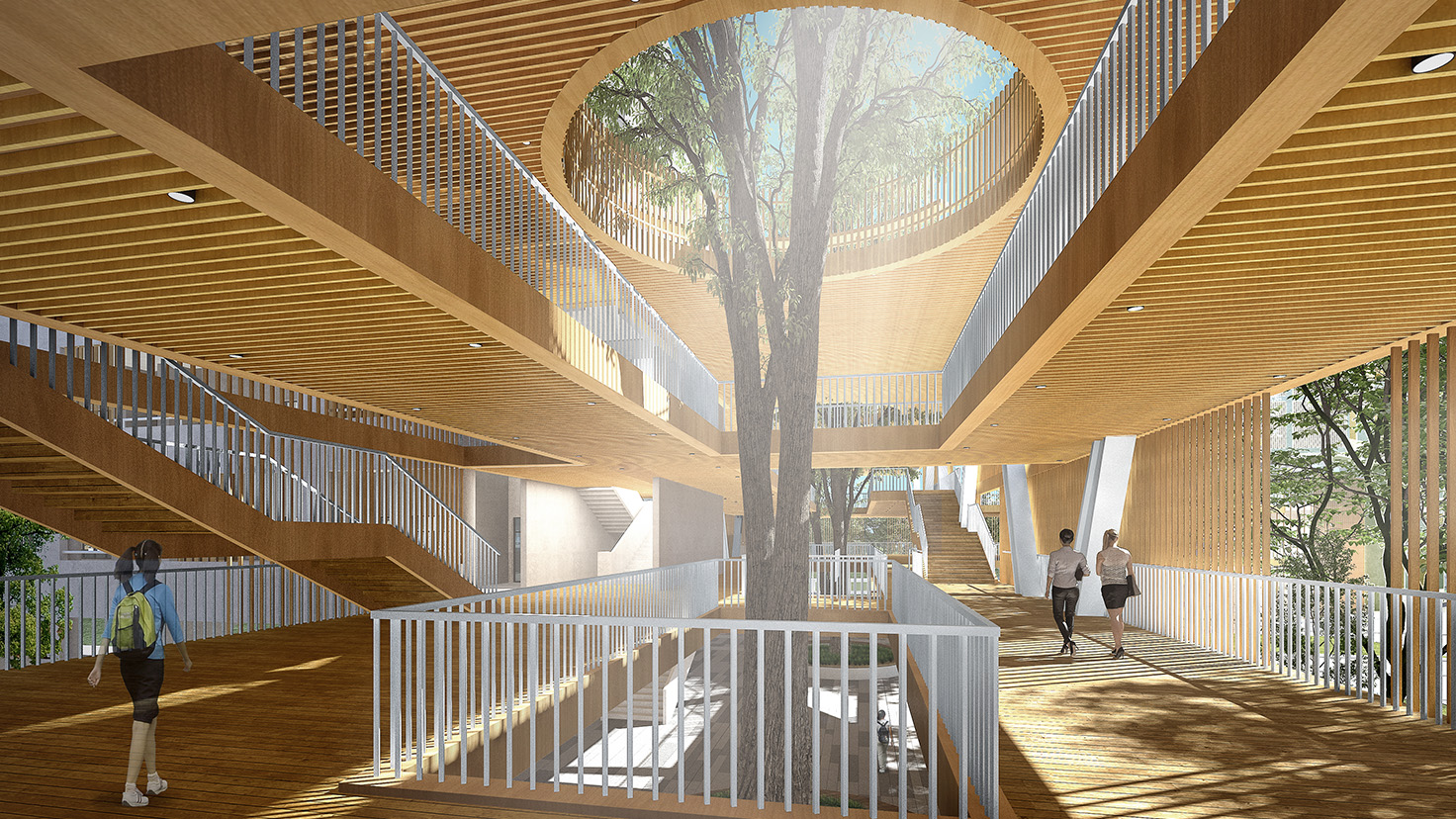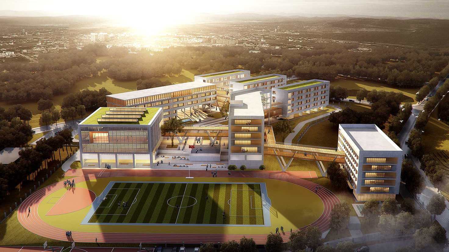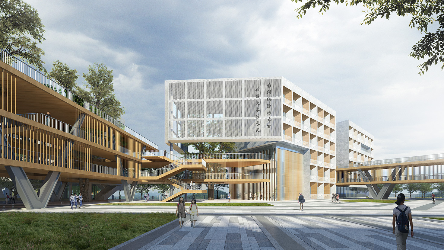 設計背景:楊昌濟,后世稱“板倉先生”,一生致力于教書育人,培養出毛澤東、蔡和森等一批國家棟梁之材。其作聯“自閉桃源稱太古,欲栽大木柱長天”正是其一生理想。 本次設計由板倉先生的理想出發,“欲栽大木柱長天”,“木”是中國教育的開始,至圣先師孔子便是在樹下為門下弟子傳道授業。讓樹木在建筑中生長,打造板倉先生理想中的教書育人的“桃源”。 由于學校各建筑功能的豐富性以及獨特性,我們將建筑進行人為的動靜分區以保證其良好的教學秩序,但是各功能區通過連廊相連接,圍合成多變的組團空間,不同尺度的內庭院相串聯,營造出安靜、舒適的教學與活動環境。