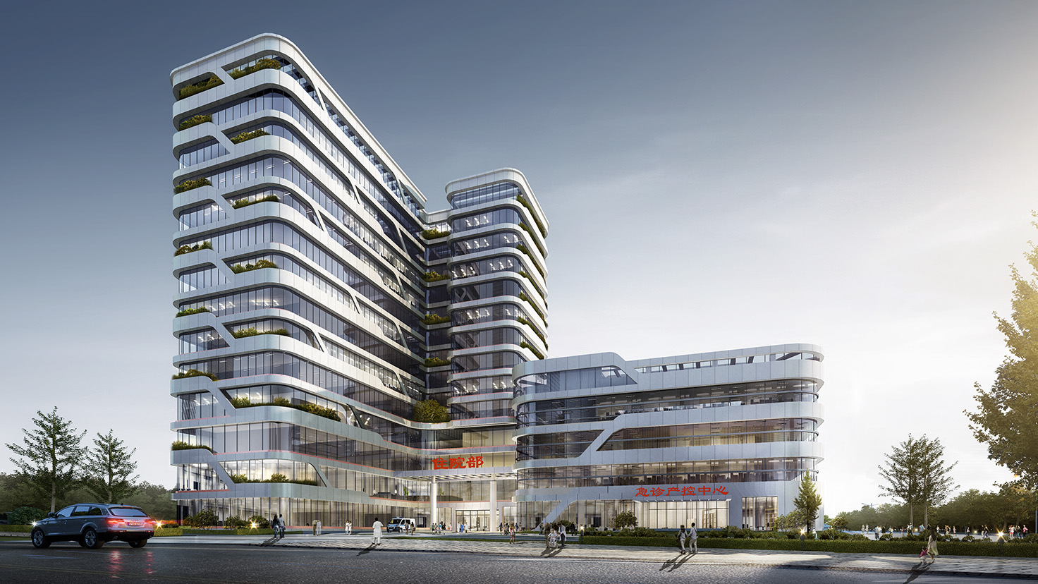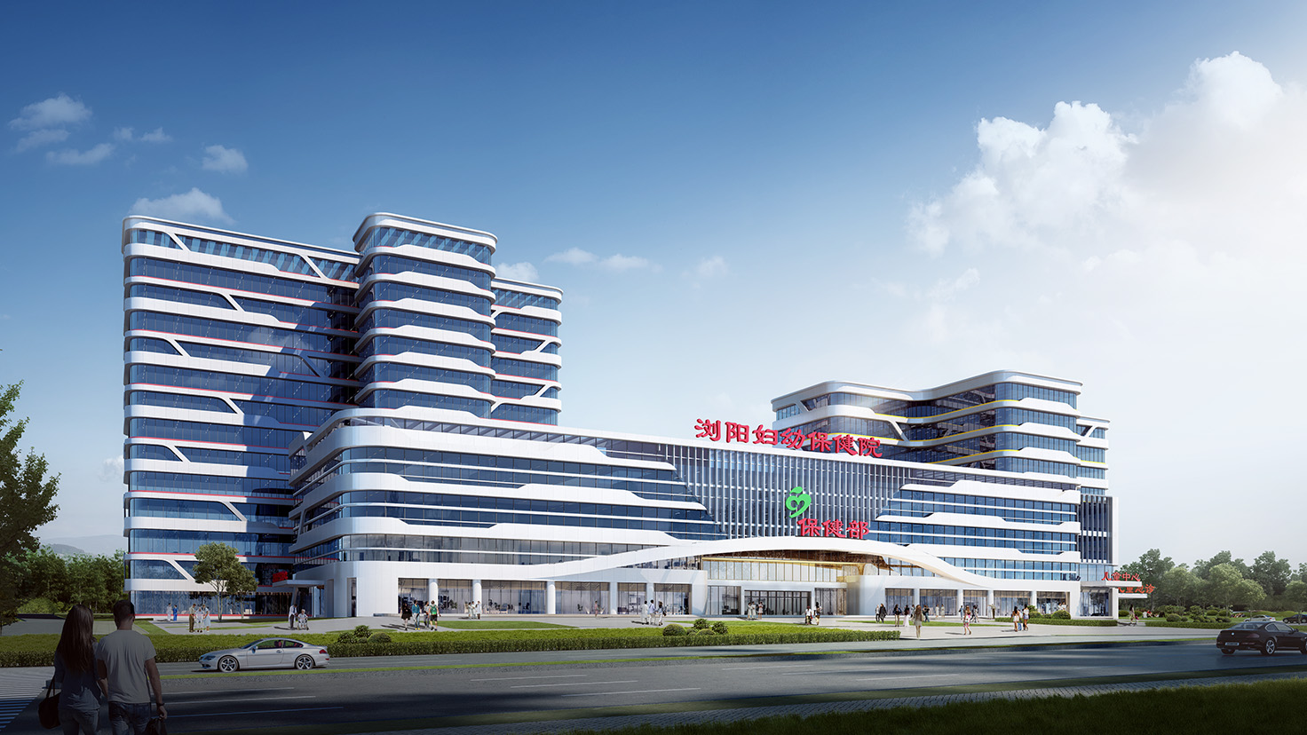 工程簡介:瀏陽市婦幼保健院擇址關口長興片區,根據婦幼保健院長期業務發展整體規劃設計,將分兩期進行建設,擬設置總床位數800張:其中一期設計床位數為550張,地上建筑面積60000平方米,地下建筑面積20000平方米,項目投資約4.5億,包含新建醫療保健綜合樓、婦產住院樓、兒童住院樓、行政后勤樓、地下停車庫(含設備用房、防空地下室)以及相關配套設施;二期設計床位數為250張,包含兒童康復中心與專科醫療中心、住院樓、培訓中心和月子中心等功能。在場地進深較小、車行開口受限的條件下,設計創造性地采用偏心十字型護理單元為基本模塊相互組合,巧妙地圍合出交通島和治愈花園,打造高效安全、以人為本的治愈之城。