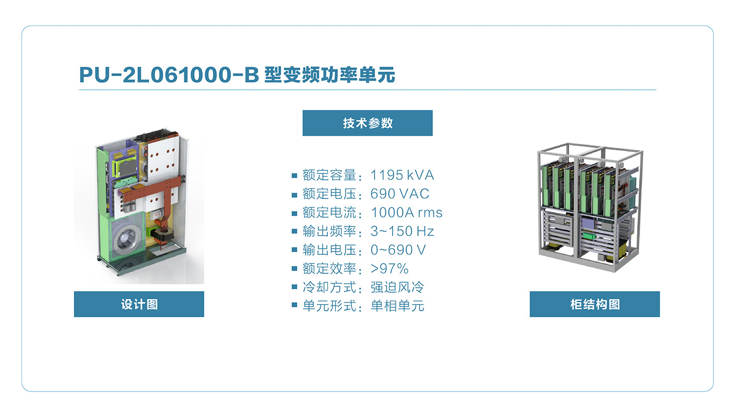 額定容量:1195 kVA 額定電壓:690 VAC 額定電流:1000A rms 輸出頻率:3~150 Hz 輸出電壓:0~690 V 額定效率:>97% 冷卻方式:強迫風冷 單元形式:單相單元
