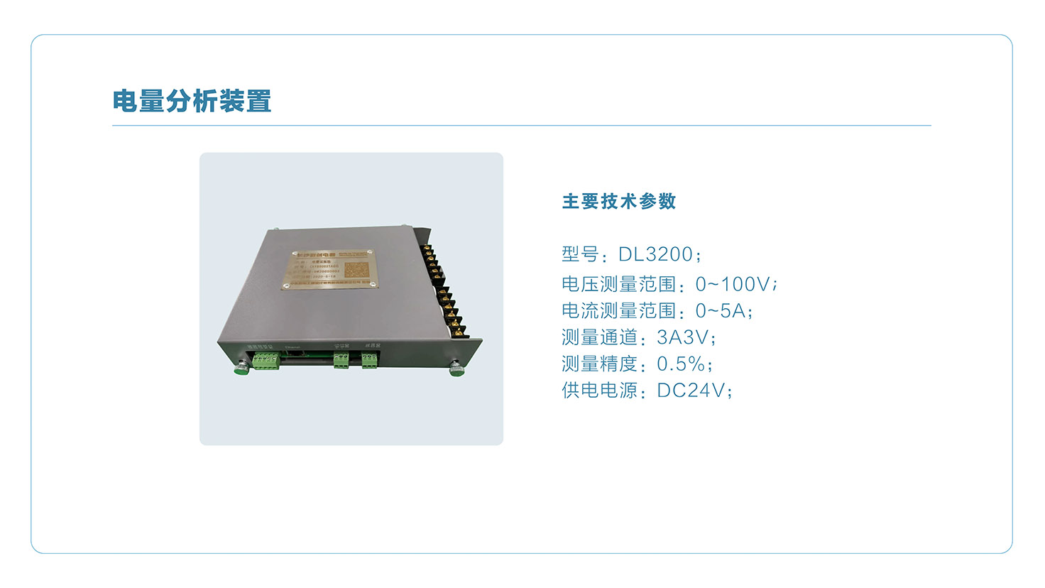 基于成熟的32位ARM嵌入式軟硬件平臺,按照嚴(yán)苛工業(yè)環(huán)境電磁兼容等級進(jìn)行設(shè)計(jì),具有結(jié)構(gòu)緊湊,性能穩(wěn)定,抗干擾性強(qiáng)等特點(diǎn),可獨(dú)立使用或集成至計(jì)算機(jī)系統(tǒng),標(biāo)配3電壓和3路電流信號采集接口,同時(shí)具備DI測量和DO報(bào)警輸出等基本功能,可以應(yīng)用于20~500Hz頻率范圍,滿足并網(wǎng)、電量分析、功率計(jì)算等不同應(yīng)用需求。